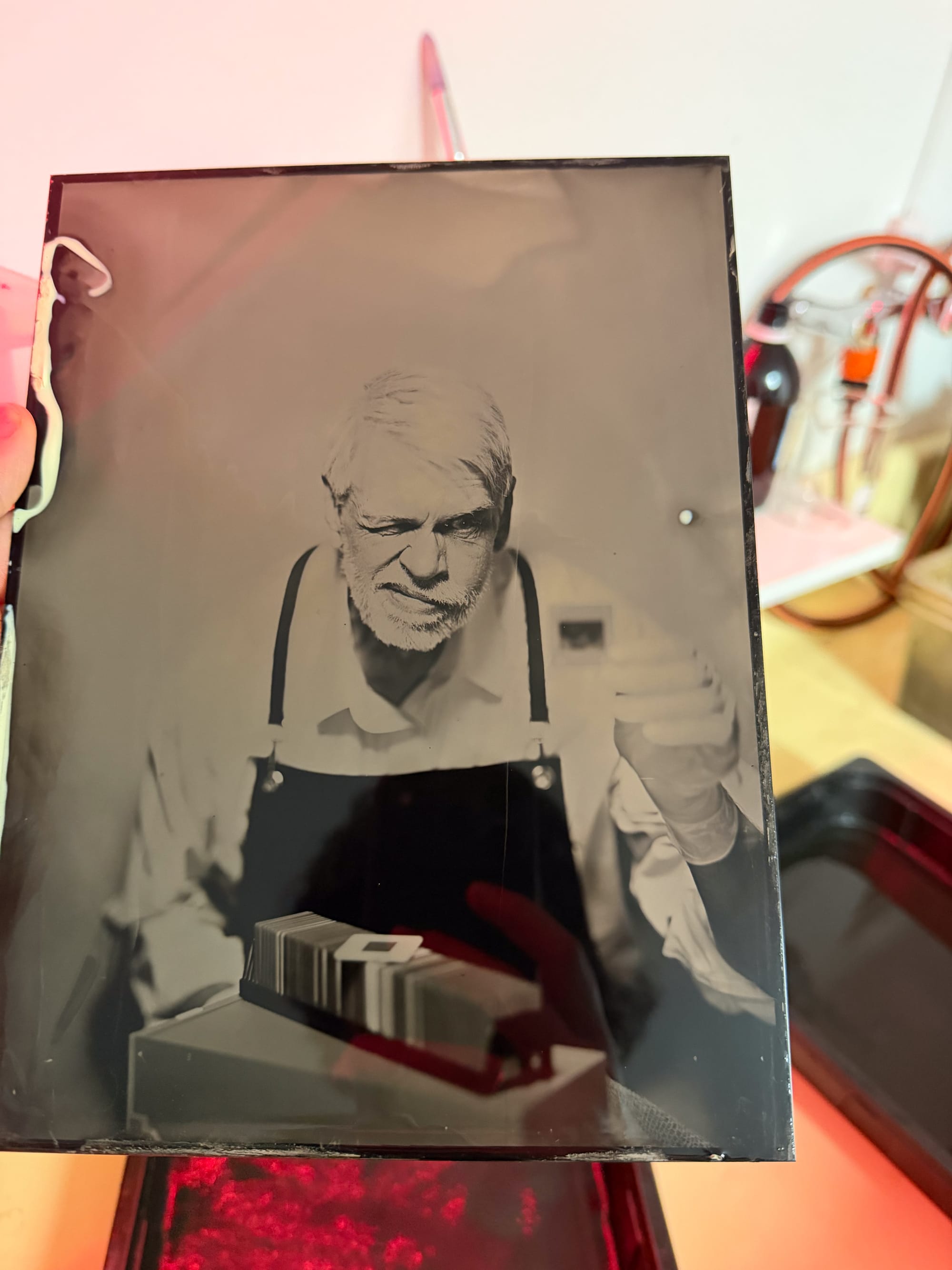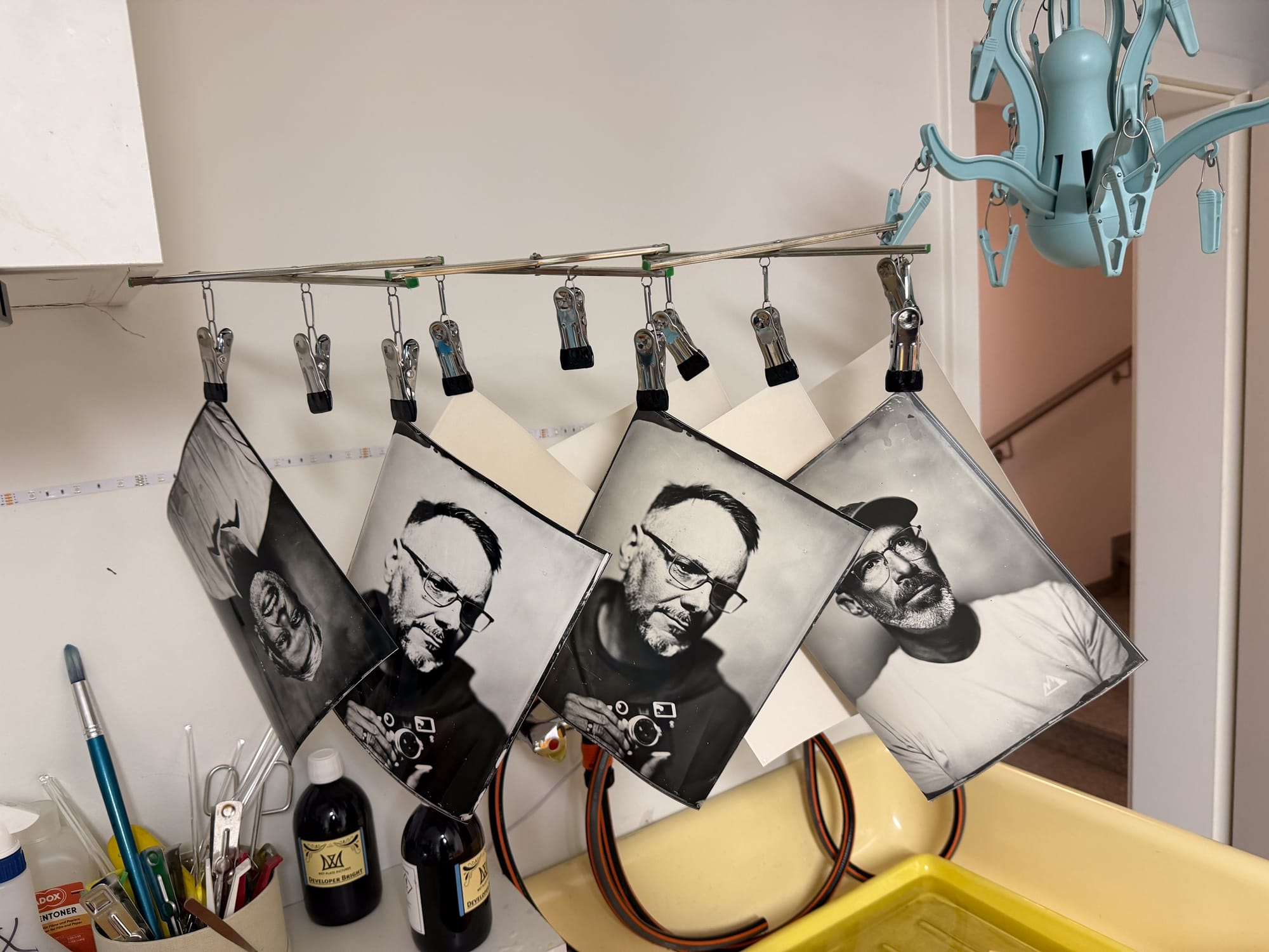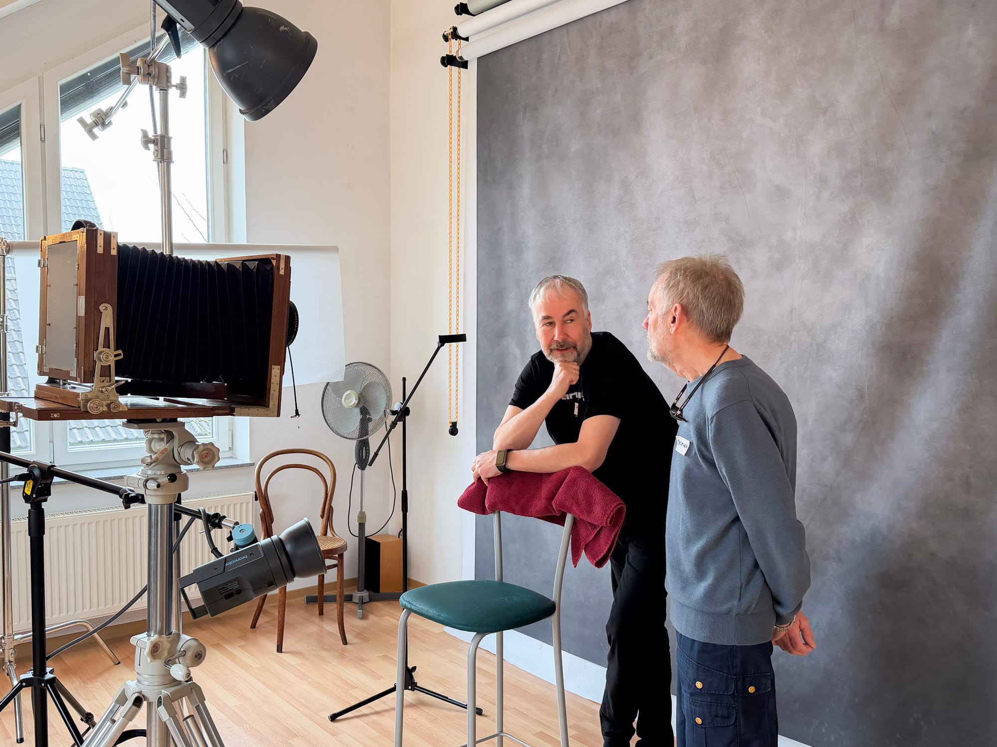 Am Samstag stand die Nassplatte im Mittelpunkt, zunächst als Ambrotypien im Format 18×24 cm (Nassplatten auf Klarglas). Was vor der Kamera dann geschieht, ist das eine; dass Frau Malek jede Glasplatte vorher selbst zuschnitt und in einem zweistufigen Verfahren bis zur letzten Spur fettfrei bekam, das andere. Ohne diese stille Vorarbeit im Hintergrund gäbe es die Bilder gar nicht. Und dann das Beschichten selbst: in einem einzigen, ruhigen Schwung muss die lichtempfindliche Kollodium-Flüssigkeit gleichmäßig über die Platte laufen, ohne Wellen, ohne Blasen, ohne Ansätze, und alles unter Zeitdruck, denn das Kollodium darf nicht antrocknen. Frau Maleks Hand blieb dabei einmalig sicher, und schon hier wurde spürbar, dass diese scheinbar einfache Bewegung eine eigene, kleine Kunst ist. Die selbst beschichteten Platten haben eine geschätzte Empfindlichkeit von ISO 1 bis 2, und genau deshalb standen im Atelier die kräftigen Blitzanlagen bereit, die die benötigten Lichtmengen in einem Augenblick liefern. Aus den Ambrotypien entstanden auf Fotopapier noch Kontaktabzüge, um den Vorteil der Ambrotypie voll auszunutzen.